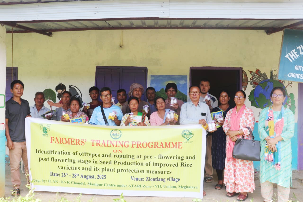 Chandel, 28/8/2025: Training programme on seed production and plant protection was conducted from 26th - 28th, August, 2025 at Ziontlang village. The trraining was organised under Plant Breeding of KVK Chandel. The main resource person was Ts. Leenda Monsang, SMS (Plant Breeding). During the training period group meeting and field visit were conducted to dissiminate awareness on the plant protection and identification of offtypes and rouging in the pre - flowering stage of rice. 20 farmers have participated the training, and input distribution like PP chemical were provided to the farmers.